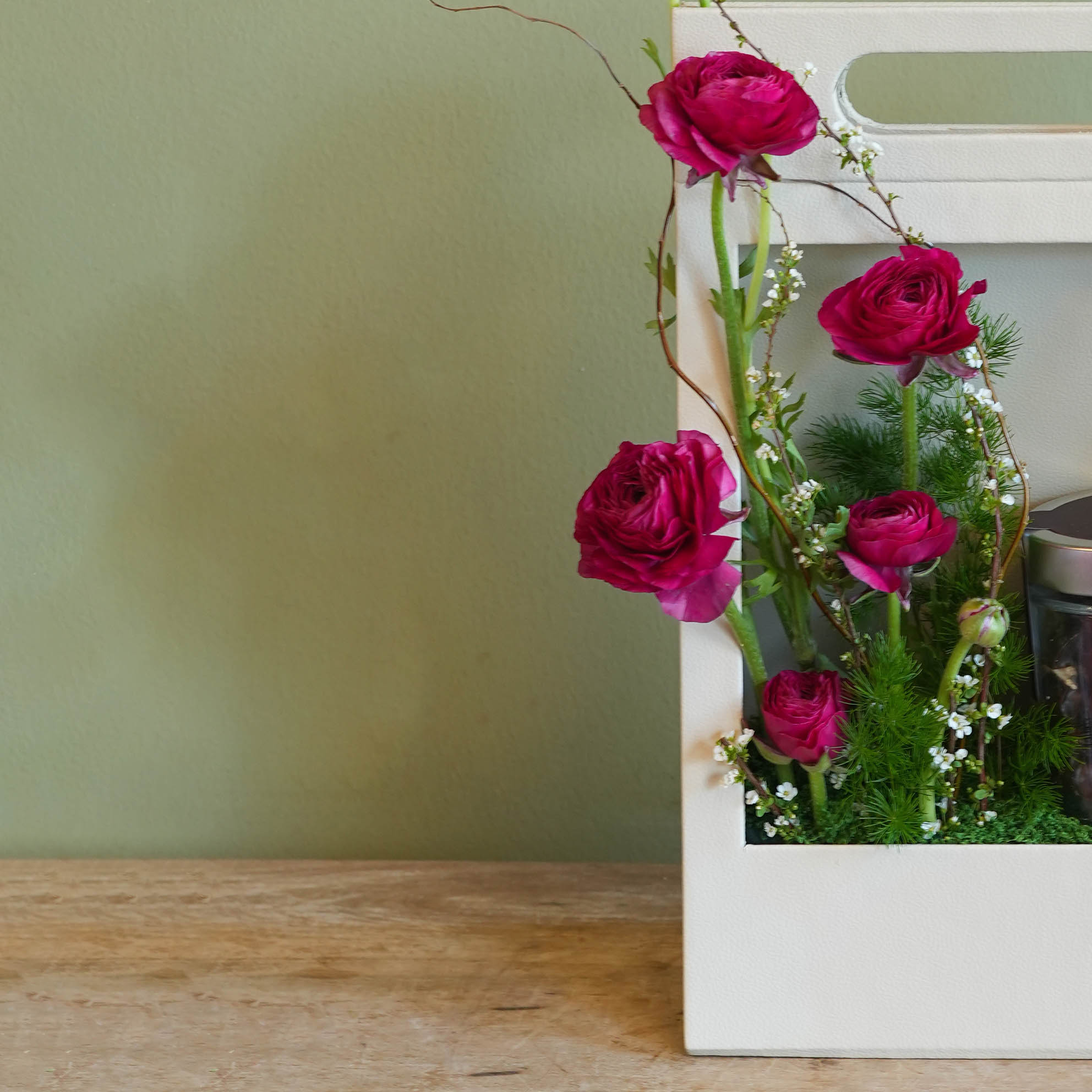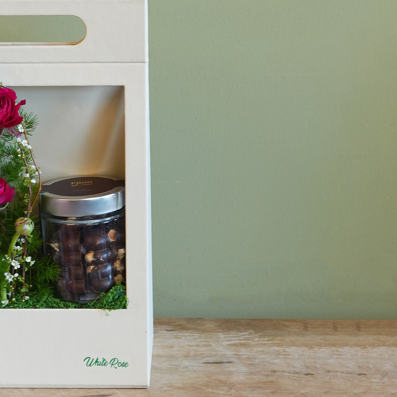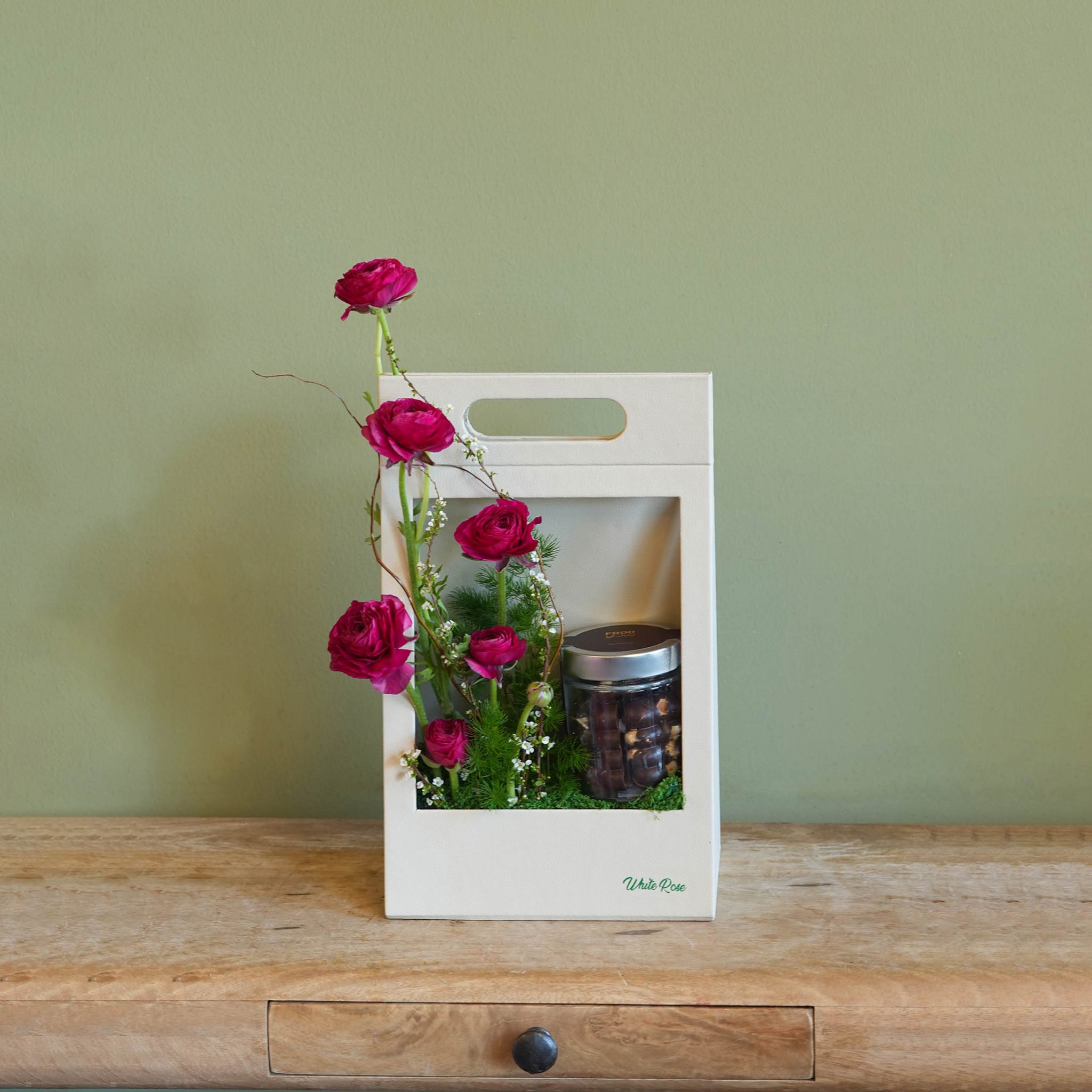 Combination of ranunculus and other mix of flowers arranged with 250g chocolate in a leather bag.