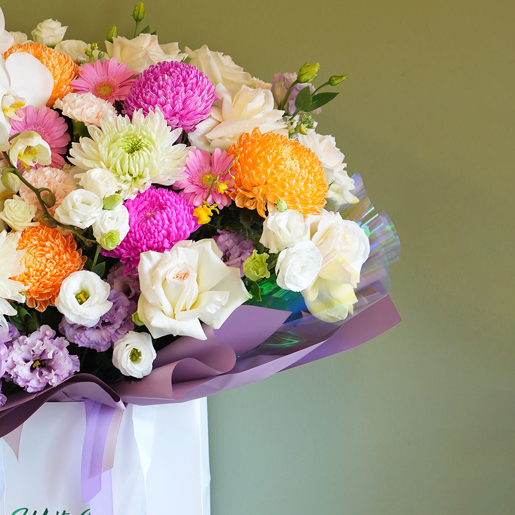 A Bouquet of Lisianthus, Baby rose, Orchid and other mix of flowers arranged in a Bag.