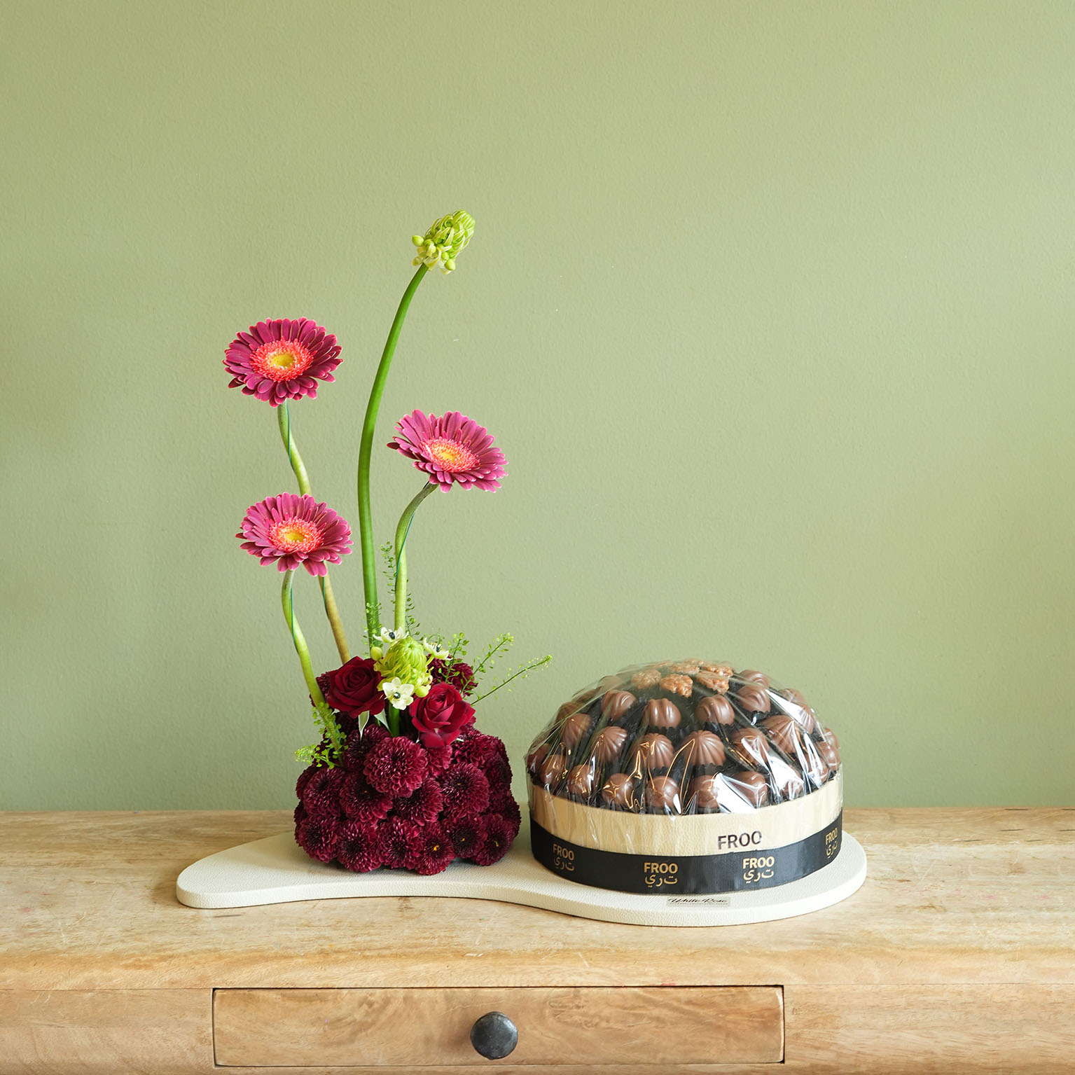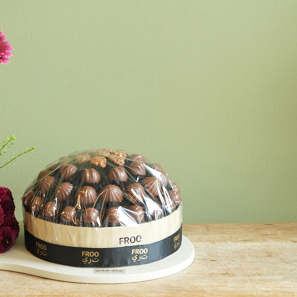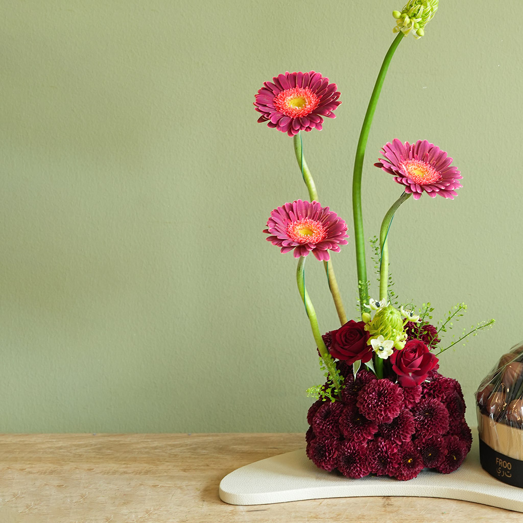 Combination of Gerbera and other mix of flowers arranged with 800g Chocolate in a Leather Tray.
